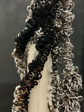 This installation invites us to deepen our intimate relationship with matter and the silver threads around us, an archaeology suspended in space as altar.